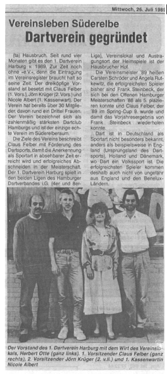 Der 1. Dart Verein Harburg von 1989 e.V. (kurz 1. DVH) ist ein etablierter Dartverein aus Harburg, der 1989 gegründet wurde und Mitglied im Landesdartverband Hamburg (LDVH) ist. Der Verein entstand aus einer Abteilung eines größeren Sportvereins und entwickelt sich seitdem eigenständig weiter. Der 1. DVH ist sowohl in regionalen Turnieren als auch in der Liga aktiv. Das Vereinsheim des 1. DVH befindet sich im Turn- und Schwimmverein Harburg am Bostelbeker Damm, wo die Mitglieder in einem modernen Trainingsumfeld spielen können